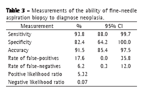 The kappa statistic revealed a significant concordance (p < 0.001) between the diagnosis established by CT-guided fine-needle aspiration biopsy and that established by the gold standard (kappa = 0.75; 95% CI: 0.57-0.93). As shown in Table 3, this concordance can be considered relatively "good" (0.61 < kappa < 0.80).