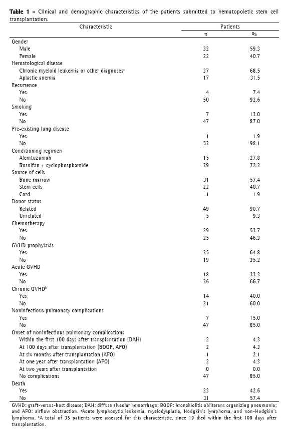 The study sample included patients older than 15 years of age who underwent allogenic HSCT between January of 2007 and March of 2008 at the Hospital das Clínicas da Universidade Federal de Minas Gerais(HC-UFMG, Federal University of Minas Gerais Hospital das Clínicas), located in the city of Belo Horizonte, Brazil. Prior to HSCT, all of the patients underwent spirometry, measurement of lung volumes, and measurement of DLCO. Patients submitted to autologous transplantation were excluded, as were those aged 15 years or younger and those who, prior to HSCT, underwent spirometry only.