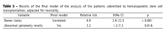 Table 5 shows the final multivariate regression model. The variable pre-existing lung disease was excluded from this analysis because of its low frequency in the sample (only in 1 patient). In this model, the variables statistically related to death were unrelated donor (RR = 9.9; p < 0.001) and abnormal spirometry results (RR = 3.2; p = 0.016). In the final model, mortality was not found to be associated with the combination of abnormal spirometry results, abnormal lung volume values, and abnormal DLCO values.