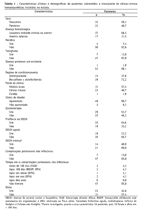 Entre janeiro de 2007 e dezembro de 2008, foram realizados 91 TCTH em pacientes no HC-UFMG. Desses, 37 foram excluídos do estudo: 18 porque o TCTH foi autólogo, 10 por terem idade < 15 anos, e 9 por terem realizado apenas espirometria antes do TCTH. Dessa forma, a amostra inicial foi constituída de 54 pacientes, cujas características clínicas estão sumarizadas na Tabela 1. Houve uma maior frequência de pacientes do sexo masculino (59%), pacientes com diagnóstico prévio de leucemia mieloide crônica ou outros diagnósticos (68%) e pacientes não fumantes (87%). Foi constatada doença pulmonar pré-existente em apenas 1 paciente, foram verificadas CPNI após o TCTH em 7 (15%). Dos pacientes submetidos ao TCTH, 18 (33%) tiveram DECH aguda, e 14/21 (40%) apresentaram DECH crônica (19 pacientes foram a óbito antes de 100 dias do procedimento, não sendo possível analisar a presença de DECH crônica). O principal regime de condicionamento utilizado foi a associação bussulfano + ciclofosfamida (em 72%), e a profilaxia para DECH com a associação ciclosporina + metotrexato foi a mais frequente (em 65%). A fonte de células mais frequente para o TCTH foi a medula óssea (57%), sendo 91% desses casos representados por doadores não aparentados. No grupo de pacientes, 4 apresentaram CPNI antes de seis meses (hemorragia alveolar difusa, em 2; bronquiolite obliterante com pneumonia em organização, em 1; e obstrução ao fluxo aéreo recente, em 1). Desses, 3 evoluíram para o óbito, exceto aquele com obstrução ao fluxo aéreo recente. Após seis meses, 3 pacientes (6%) desenvolveram obstrução ao fluxo aéreo; porém, após dois anos de seguimento, não foi observado nenhum evento novo. Dos 4 pacientes que desenvolveram obstrução ao fluxo aéreo recente, 2 melhoraram durante o acompanhamento.