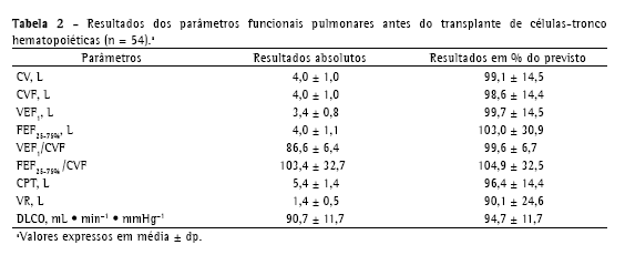 Os resultados do presente estudo mostraram que a maioria dos pacientes (78%) apresentou TFP (medida de volumes pulmonares absolutos, espirometria e DLCO) normais antes do TCTH e que, mesmo aqueles que apresentaram alterações desses testes antes do TCTH, realizaram o procedimento.
