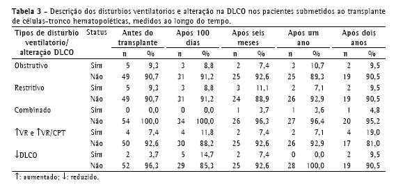 Os distúrbios ventilatórios mais frequentemente observados, baseados nos dados de espirometria, medida de volumes pulmonares e DLCO, são apresentados na Tabela 3. Observa-se que 22,2% dos pacientes apresentaram alterações significativas nos TFP antes do TCTH. O aumento de VR e da relação VR/CPT não esteve associado a distúrbio ventilatório obstrutivo nem antes, nem após o TCTH. Apenas 1 paciente com obstrução ao fluxo aéreo antes do TCTH sobreviveu após o transplante. Nos 5 pacientes em que se constatou obstrução ao fluxo aéreo recente, 3 foram submetidos à intervenção terapêutica específica. Desses, 1 paciente com bronquiolite obliterante com pneumonia em organização evoluiu para óbito, enquanto 2 com obstrução ao fluxo aéreo recente melhoraram com o tratamento instituído. Todos os pacientes com CV reduzida apresentaram, também, CPT reduzida. Dos sobreviventes, 7 não realizaram os testes pulmonares ao final de dois anos de seguimento.