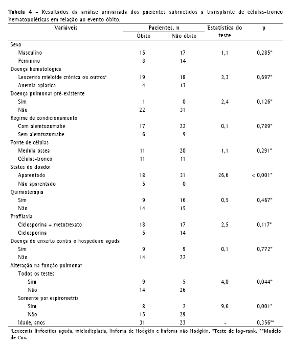 Objetivo: Verificar se os resultados dos testes de função pulmonar realizados em pacientes submetidos a transplante de células-tronco hematopoiéticas (TCTH) estão associados com a mortalidade após o procedimento. Métodos: Estudo prospectivo no qual foram incluídos pacientes maiores de 15 anos submetidos a TCTH alogênico, entre janeiro de 2007 e março de 2008, no Hospital das Clínicas da Universidade Federal de Minas Gerais, em Belo Horizonte (MG), e que realizaram espirometria, medida de volumes pulmonares e medida de DLCO antes do TCTH. Os testes foram repetidos seis meses, um ano e dois anos após TCTH. Para a análise de sobrevida, foram utilizados o método de Kaplan-Meier e testes de log-rank bicaudal. O risco relativo (RR) e IC95% foram calculados por meio do ajuste do modelo de riscos proporcionais de Cox. O modelo de regressão de Cox foi utilizado na análise multivariada. Resultados: Dos 54 pacientes incluídos, 40 (74,1%) apresentaram resultados normais de função pulmonar antes do TCTH. Ocorreram 23 óbitos (42,6%) em dois anos após o TCTH, sendo que 19 aconteceram antes de 100 dias. Dos 23 óbitos, 11 (47,8%) foram por septicemia e 10 (43,4%) por insuficiência respiratória aguda associada à septicemia. As únicas variáveis que mostraram associação significativa com mortalidade após TCTH foram alteração na espirometria antes do TCTH (RR = 3,2; p = 0,016) e doador não aparentado (RR = 9,0; p < 0,001). Conclusões: A realização da espirometria antes do TCTH fornece valores basais para comparações futuras. Alterações nesses resultados indicam um maior risco de mortalidade após o TCTH, embora esses não contraindicam o procedimento.