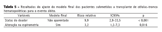 O modelo de regressão multivariado final é apresentado na Tabela 5. A variável doença pulmonar pré-existente foi retirada dessa análise pela baixa frequência na amostra (apenas 1 paciente). Nesse modelo, as variáveis estatisticamente relacionadas ao óbito foram status do doador não aparentado (RR = 9,9; p < 0,001) e alteração na espirometria (RR = 3,2; p = 0,016). No modelo final, não se observou associação da mortalidade com alterações na espirometria, medida de volumes pulmonares e medidas de DLCO avaliadas em conjunto.