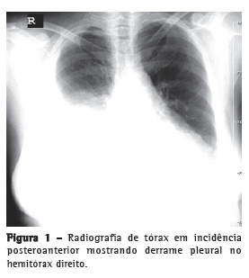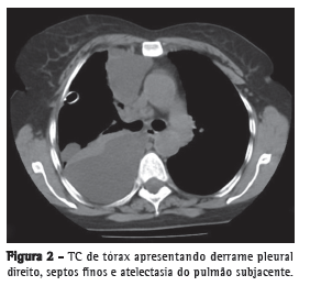 O exame físico revelava palidez e temperatura corporal de 38,4°C. Movimentos torácicos estavam diminuídos. A ausculta do hemitórax direito revelava macicez à percussão e abolição de sons respiratórios, que são achados consistentes com derrame pleural. Não foram encontradas alterações em relação aos outros sistemas.
