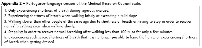 The MRC scale comprises only five items, and the patient chooses the item that corresponds to the degree to which dyspnea limits their ADL performance.(11) As can be seen in Appendix 2, patients report the subjective degree of dyspnea by choosing a value from 1 to 5: 1 (experiencing shortness of breath only during vigorous exercise); 2 (experiencing shortness of breath when walking briskly or ascending a gentle slope); 3 (walking slower than other people their age due to shortness of breath or having to stop in order to catch their breath even when walking slowly); 4 (stopping in order to catch their breath after walking less than 100 m or after a few minutes); and 5 (experiencing so much shortness of breath that they no longer leave the home, or experiencing shortness of breath when getting dressed).