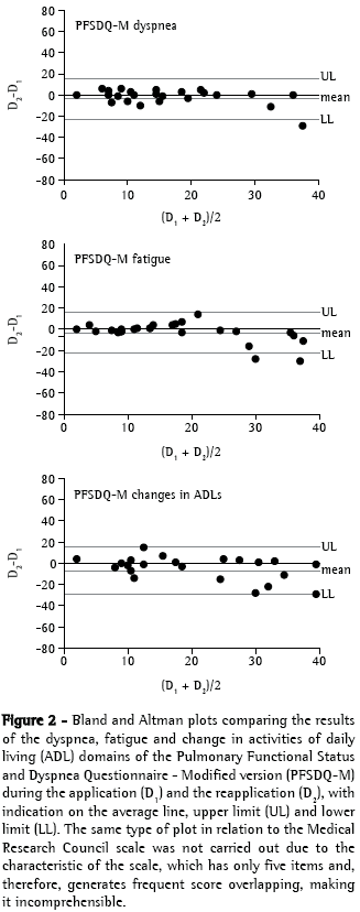 Abstract Objective: To determine the validity and reproducibility of two subjective instruments to assess limitations in activities of daily living (ADLs) in patients with chronic obstructive pulmonary disease (COPD) in Brazil: the Pulmonary Functional Status and Dyspnea ­Questionnaire ‑ ­Modified version (PFSDQ-M) and the Medical Research Council (MRC) scale. Methods: Thirty patients with COPD (age, 67 ± 10 years; males, 17; forced expiratory volume in one second, 42% ± 13% of predicted) completed the Portuguese-language versions of the two instruments on two occasions, one week apart. The PFSDQ-M has three components: influence of dyspnea on ADLs, influence of fatigue on ADLs and change experienced by the patient with ADLs. The MRC scale is simple, with only five items, in which patients report the degree to which dyspnea limits their performance of ADLs. The traditional Saint George's Respiratory Questionnaire (SGRQ), previously validated for use in Brazil, was used as a validation criterion. Results: The test-retest reliability (intraclass correlation coefficient) of the PFSDQ-M was 0.93, 0.92 and 0.90 for the dyspnea, fatigue and change components, respectively, compared with 0.83 for the MRC scale. Bland-Altman plots showed good test-retest concordance for the PFSDQ-M. The components of the PFSDQ-M and the MRC scale correlated significantly with all of the domains and the total score on the SGRQ (0.49 < r < 0.80; p < 0.01 for all). Conclusions: The Portuguese-language versions of the PFSDQ-M and the MRC scale proved reproducible and valid for use in patients with COPD in Brazil.