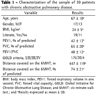 Patients were recruited during their initial assessment prior to enrollment in a pulmonary rehabilitation program at the Hospital Universitário Regional Norte do Paraná (HURNPR, Northern Paraná University Hospital), located in the city of Londrina, Brazil. The characteristics of the sample are described in Table 1. The diagnosis of COPD was made according to internationally accepted criteria established by the Global Initiative for Chronic Obstructive Lung Disease.(1) The size of the sample was defined based on the validation studies of the Portuguese-language version of the SGRQ.(13,15) In addition to the diagnosis of COPD, the following inclusion criteria were used: stable condition, free of exacerbations or infections within the last three months; absence of severe or unstable heart disease; and absence of other pathological conditions that could influence ADL performance (for example, cerebrovascular, orthopedic or rheumatic disease). Exclusion criteria were as follows: occurrence of acute exacerbation during the assessment period; and lack of understanding or of cooperation regarding the questionnaires and other assessment methods, according with the subjective judgment of the interviewer who applied the instruments and tests. The study was approved by the Ethics in Research Committee of the Londrina State University HURNPR, and the data were collected from February to September of 2007. In order to participate in the study, all patients gave written informed consent prior to their inclusion.