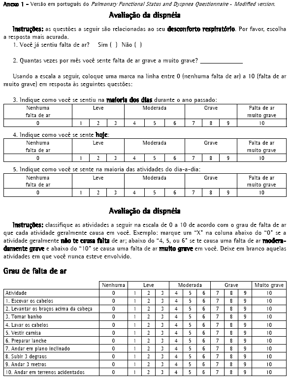 Versão modificada do Pulmonary Functional Status and Dyspnea QuestionnaireO PFSDQ-M é composto por três domínios: influência da dispnéia nas AVD, influência da fadiga nas AVD (5 itens gerais e 10 específicos para cada domínio) e mudança nas AVD em comparação ao período anterior à doença (10 itens específicos).(10) O paciente relata o quanto a dispnéia e a fadiga interferem nos 10 itens específicos de AVD, escolhendo para cada atividade um valor entre 0 e 10: 0 (nenhuma interferência), 1-3 (leve), 4-6 (moderada), 7-9 (grave) e 10 (muito grave). No terceiro domínio, o paciente relata de quanto foi a mudança nas AVD em comparação ao período anterior à doença, escolhendo para cada atividade um valor entre 0 e 10: 0 (tão ativo como sempre em relação a essa atividade), 1-3 (pequena mudança), 4-6 (mudança moderada), 7-9 (mudança extrema) e 10 (não faz mais essa atividade). Um escore parcial é calculado, variando de 0 a 100 para cada um dos três domínios (dispnéia, fadiga e mudança nas AVD), e um escore total é formado pela soma dos escores parciais dos três domínios, totalizando um valor que varia de 0 a 300. Valores mais altos na escala indicam maior limitação nas AVD. As cinco questões gerais nos domínios dispnéia e fadiga são de caráter informativo e qualitativo, e suas respostas não são contabilizadas na pontuação do questionário (Anexo 1).