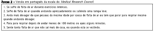 Escala do Medical Research CouncilA escala do MRC é composta por apenas cinco itens, sendo que o paciente escolhe o item que corresponde a quanto a dispnéia limita suas AVD.(11) O paciente relata seu grau subjetivo de dispnéia escolhendo um valor entre 1 e 5: 1 (só sofre de falta de ar durante exercícios intensos), 2 (sofre de falta de ar quando andando apressadamente ou subindo uma rampa leve), 3 (anda mais devagar do que pessoas da mesma idade por causa de falta de ar ou tem que parar para respirar mesmo quando andando devagar), 4 (pára para respirar depois de andar menos de 100 m ou após alguns minutos) e 5 (sente tanta falta de ar que não sai mais de casa, ou sente falta de ar quando está se vestindo) (Anexo 2).