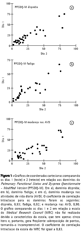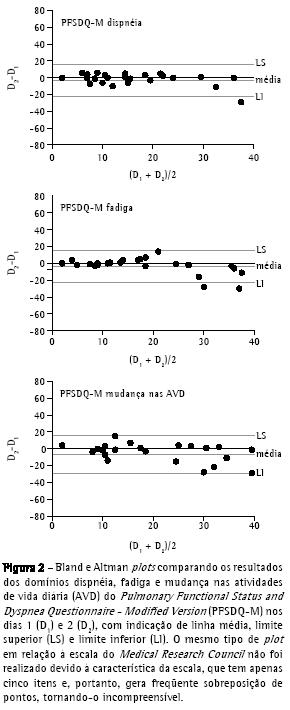 O CCI dos diferentes domínios do PFSDQ-M entre os dias 1 e 2 apresentou os seguintes resultados: Dispnéia, 0,93; Fadiga, 0,92; e Mudança nas AVD, 0,90.