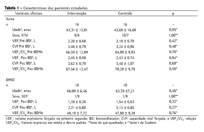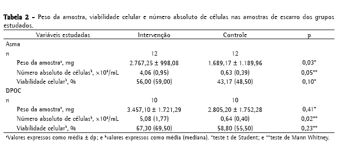Os pacientes foram categorizados em quatro grupos: DPOC/intervenção, DPOC/controle, asma/intervenção e asma/controle. Cada grupo foi avaliado quanto às seguintes variáveis: idade, sexo, escore final de sintoma de tosse, volume expiratório forçado no primeiro segundo (VEF1), capacidade vital forçada (CVF), relação VEF1/CVF antes do uso (para pacientes asmáticos) ou após o uso de broncodilatadores (para pacientes com DPOC), peso final do escarro após filtragem e diluição, número absoluto de células (×106/mL), viabilidade celular (%), tempo para obtenção do escarro, saturação periférica de oxigênio (SpO2) e freqüência cardíaca (FC).