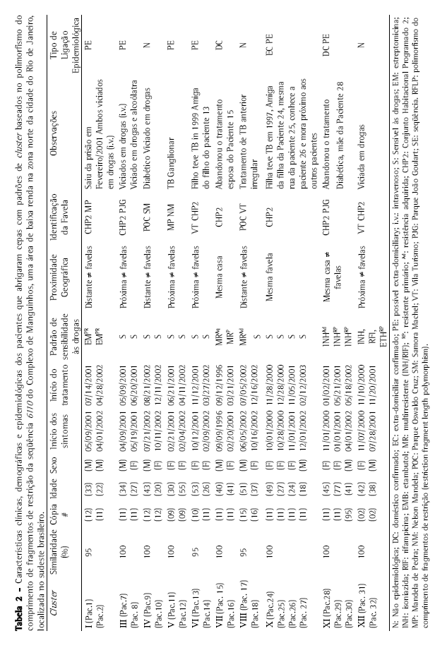 No presente estudo, além da clássica transmissão entre parentes, o contato fora de casa pode ter tido um papel importante na transmissão em uma área superlotada. Isto tem respaldo em nossos achados relacionados aos clusters VI, X e XI, nos quais ao menos um dos pacientes teve contato domiciliar anterior com a TB. No entanto, as cepas naqueles casos, com exceção daqueles no cluster XI, não estavam disponíveis para tipagem. Os outros pacientes incluídos naqueles clusters tiveram contato com a infecção, seja intenso ou casual, fora de casa.