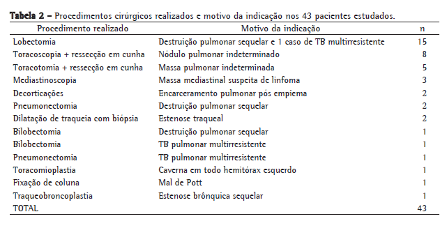 O exame anatomopatológico confirmou o diagnóstico de TB ativa em 26 dos 35 pacientes pesquisados e de TB sequelar nos outros 9. Nos 8 pacientes não pesquisados, o diagnóstico foi de TB sequelar. Os procedimentos cirúrgicos realizados, bem como os motivos da indicação da cirurgia estão apresentados na Tabela 2.