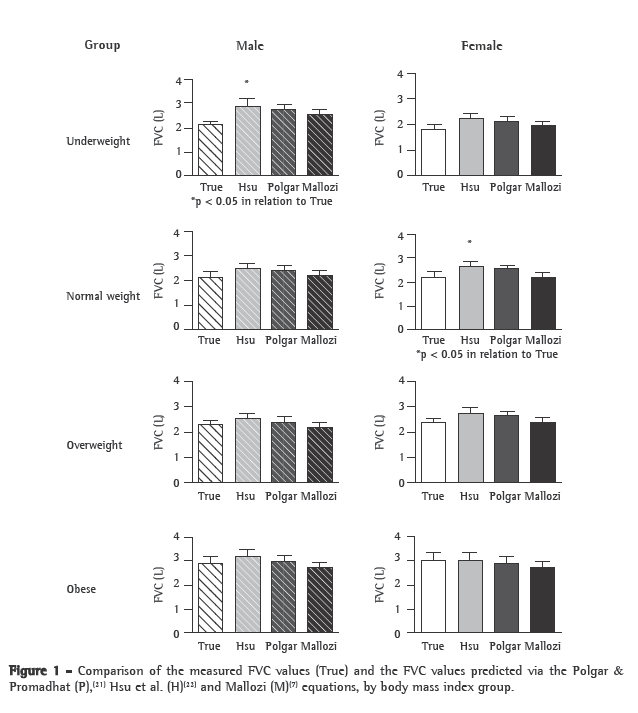 The FVC values for normal weight females and underweight males predicted via the Hsu et al. equation(22) were significantly higher than were the measured values. In normal weight, overweight and obese males, as well as in underweight, overweight and obese females, there were no differences between the measured FVC values and the FVC values predicted via the three sets of equations.