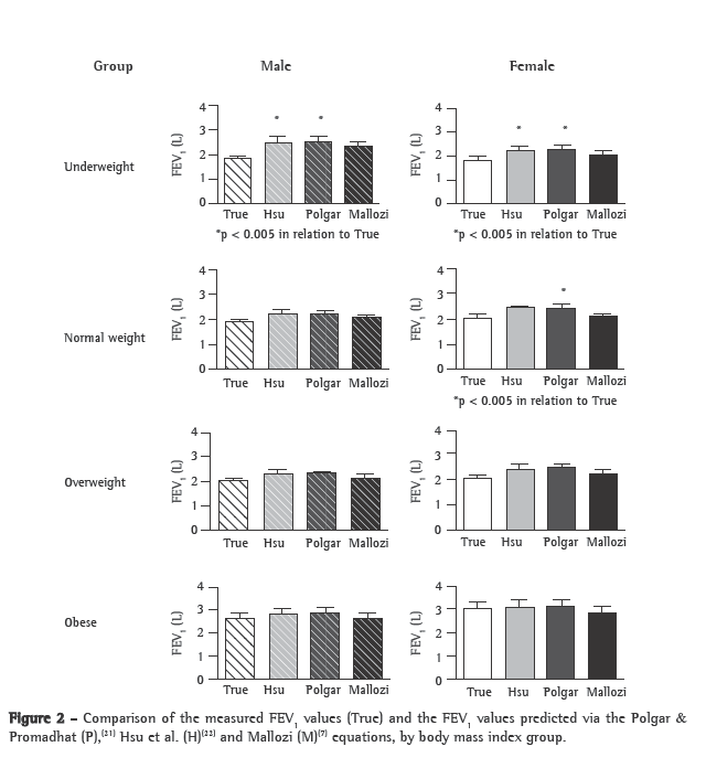 The FEV1 values for underweight males and females predicted via the Polgar & Promadhat(21) and Hsu et al.(22) equations were significantly higher than were the measured values. In normal weight females, the FEV1 values predicted via the Polgar & Promadhat equation(21) were significantly higher than were the measured values. In normal weight, overweight and obese males, as well as in overweight and obese females, there were no differences between the measured FEV1 values and the FEV1 values predicted via the three sets of equations.