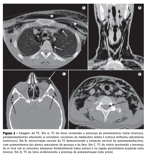 A TC de crânio, pescoço e tórax confirmou a presença de pneumomediastino, pneumotórax (Figura 2A), extenso enfisema de tecidos moles na região cervical (Figura 2B), incluindo face, tecidos periorbitários e músculos temporais (Figura 2C), além de documentar a presença de pneumorraque (Figura 2D).