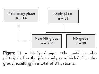 For the overall analysis of the study, the patients who participated in the preliminary phase were included in the non-NO group. Therefore, the sample comprised 73 patients, 39 in the NO group and 34 in the non-NO group, as shown in the algorithm (Figure 1).
