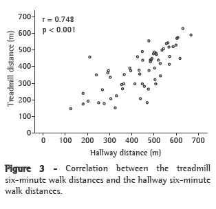 In addition to the correlation with the functional class and hemodynamic values, the tread6MWD also correlated with the 6MWD. This shows that, like the 6MWT, the tread6MWT can measure the functional capacity of individuals by the simple act of walking. However, one test does not replace the other. The tread6MWD was shorter than the 6MWD, which was due to various factors, such as the need for coordinating upper and lower limbs in order to walk according to a speed protocol that was not established by the patient; the use of the treadmill, a device with which most of the patients included in the present study were unfamiliar; and limited maximum speed, so that the tread6MWT remained a test of submaximal effort. Therefore, the tread6MWD according to our protocol cannot be compared with the 6MWD. Both tests evaluate functional capacity in a similar, although not identical, manner.