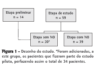 Para a análise global do estudo, os pacientes que participaram da etapa preliminar foram incluídos no grupo sem NO; desta forma, a amostra total do estudo foi de 73 pacientes, 39 no grupo com NO e 34 no grupo sem NO, conforme apresentado no algoritmo (Figura 1).