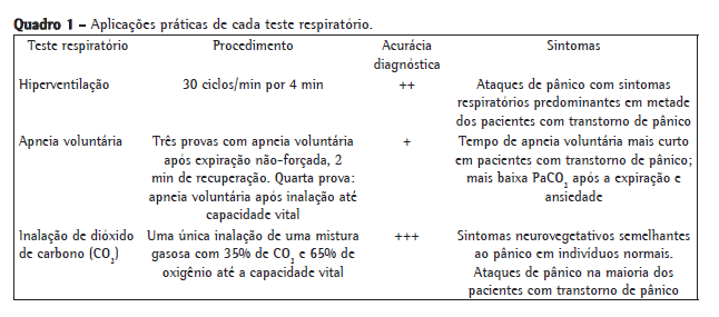 O teste de indução de pânico com hiperventilação aguda (30 ciclos/min por 4 min) pode causar sintomas semelhantes a pânico em uma parcela significativa de pacientes com transtorno de pânico.(33) Em um estudo prévio,(7) nosso grupo descreveu as características clínicas de ataques de pânico induzidos por hiperventilação em pacientes com transtorno de pânico, comparando tais ataques a ataques de pânico espontâneos nos mesmos pacientes e a ataques de pânico em pacientes com transtorno de pânico não sensíveis ao teste de hiperventilação. Dentre os 88 pacientes com transtorno de pânico, 45 (51.1%) tiveram um ataque de pânico após a hiperventilação. Os pacientes que reagiram com pânico durante o teste geralmente apresentavam histórico familiar de transtornos mentais, eram mais velhos quando da manifestação clínica da doença e tinham histórico de episódios de depressão. Os ataques de pânico espontâneos ou induzidos foram bastante semelhantes nos indivíduos que desenvolveram ataques de pânico. No entanto, nos indivíduos que não reagiram com pânico após a hiperventilação os ataques de pânico espontâneos eram geralmente ­acompanhados de surtos de calor ou frio e raramente acompanhados de sintomas respiratórios como falta de ar, sensação de engasgamento, dores ou desconforto no peito, parestesia e medo de morrer. Em outro estudo envolvendo uma semana de automonitoramento, indivíduos com ataque de pânico induzido por hiperventilação relataram maior frequência e severidade dos sintomas respiratórios, preenchendo os critérios do subtipo respiratório do transtorno de pânico.(9)