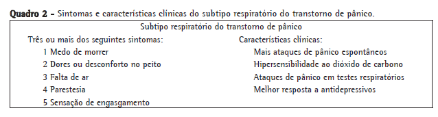Há inúmeras evidências científicas da existência de um subtipo respiratório do transtorno de pânico. Os sintomas e as características clínicas desse subtipo são descritos no Quadro 2.