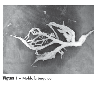 Paciente masculino, 53 anos, branco, separado, marinheiro, natural do Rio de Janeiro e procedente de Maringá, com história prévia de etilismo, tabagismo e asma na infância; portador de diabetes mellitus e em tratamento há quatro meses para hepatite C com interferon peguilado e ribavirina. Desde o início desse tratamento, iniciou com quadro de dispneia progressiva e tosse, sendo que nos últimos dois meses os sintomas pioraram e surgiram febre intermitente, perda ponderal (4 kg em dois meses) e tosse persistente e em "crises". Na semana da admissão hospitalar, apresentava dispneia incapacitante que cessava após a eliminação de secreção abundante, evidenciando formas brônquicas (Figuras 1 a 3). O esforço do paciente para a eliminação dos moldes era exaustivo e angustiante, obrigando esse, de forma espontânea, a permanecer em decúbito ventral com o tórax para fora do leito em direção ao solo numa tentativa de auxiliar a eliminação dos moldes. Diante dos sintomas apresentados, foi instituído tratamento com broncodilatadores e corticoide (oral e inalatório). No exame físico, apresentava dispneia precedendo a expulsão dos moldes, assim como roncos e sibilos difusos na ausculta pulmonar. Exames laboratoriais como hemograma, eletrólitos, gasometria arterial e provas inflamatórias não mostraram alterações, com exceção da IgE sérica, que se encontrava aumentada (300 UI/mL). Outros exames complementares como sorologia anti-HIV, pesquisa de fungos e TB nos moldes também foram todos negativos. A fibrobroncoscopia também não evidenciou alterações endobrônquicas, e o lavado broncoalveolar coletado não contribuiu para o diagnóstico; o exame micológico direto e o cultivo do molde brônquico foram negativos. Na tentativa de elucidar o caso, foi realizada biópsia transbrônquica, cuja análise anatomopatológica evidenciou inflamação crônica e fibrose intersticial em parênquima pulmonar com acúmulo de macrófagos alveolares espumosos e inflamação crônica em parede bronquiolar. Considerando a hipótese da associação entre interferon peguilado e os moldes brônquicos, foi proposto à equipe da hepatologia, responsável pelo tratamento da hepatopatia, a suspensão do tratamento com interferon. Não houve concordância, e o paciente então seguiu o tratamento até o prazo proposto. Após 30 dias da interrupção do tratamento com interferon e ribavirina, o paciente não mais apresentava sintomas respiratórios.