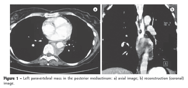 Posterior mediastinal tumors comprise a large spectrum of rare conditions, the most common of which are lymphomas and neurogenic tumors.(9) Hodgkin's lymphoma is the most common lymphoma affecting the mediastinum. Neurogenic tumors fall into two major categories: neoplasms of the sympathetic nervous system (neuroblastomas, ganglioneuroblastomas and ganglioneuromas); and peripheral nerve sheath tumors (schwannomas, neurofibromas and malignant peripheral nerve sheath tumors).(10) Histologically, RDD and Hodgkin's lymphoma can present certain overlapping features, the latter occasionally presenting an inflammatory appearance and large neoplastic cells resembling large histiocytes. However, the two entities can easily be distinguished through careful examination of the infiltrate, identification of unequivocal images of emperipolesis in RDD, identification of neoplastic Reed-Stenberg cells in Hodgkin's lymphoma and immunophenotyping.