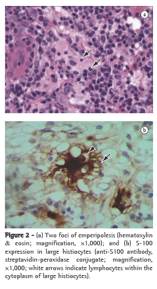 Rosai-Dorfman disease (RDD), or sinus histiocytosis with massive lymphadenopathy, is characterized by massive painless bilateral lymphadenomegaly that typically involves the lymph node stations of the head and neck. The typical presentation includes fever, leukocytosis, elevated erythrocyte sedimentation rate and polyclonal hypergammaglobulinemia. Most cases occur in the first two decades of life, although any age group can be affected. The classical morphological profile is of an inflammatory infiltrate rich in lymphocytes, plasma cells and large histiocytes, the last occasionally presenting emperipolesis, which is the hallmark of the disease.(1) Emperipolesis is defined as the active penetration by one cell into and through a larger cell, which, in the case of RDD, manifests as mature lymphocytes within the cytoplasm of large histiocytes.