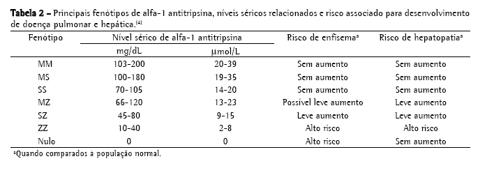O fenótipo mais freqüentemente relacionado a manifestações pulmonares (96% dos casos) é o PiZZ, que implica concentrações séricas de AAT de menos de 20% dos valores normais.(4) Contudo, indivíduos heterozigotos portadores da mutação Z (ou de outras mutações mais raras) também podem apresentar risco aumentado de enfisema, dependendo de múltiplos fatores, como tabagismo e exposições ocupacionais e ambientais (Tabela 2).