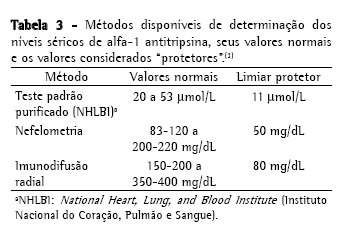 Os testes quantitativos comercialmente disponíveis, que empregam imunodifusão radial ou nefelometria, tendem a superestimar os níveis séricos quando comparados ao teste padrão purificado do National Heart, Lung, and Blood Institute (NHLBI).(37) Além disso, a AAT comporta-se como uma proteína de fase aguda, e seus níveis séricos podem estar falsamente aumentados durante processos inflamatórios e infecciosos.(4) Ainda assim, a dosagem dos níveis séricos de AAT é fundamental no processo diagnóstico, sendo que os valores normais variam de acordo com o método empregado (Tabela 3).(3)