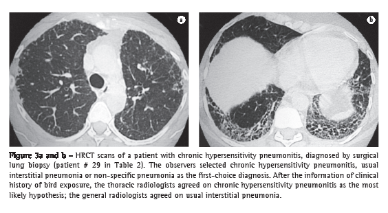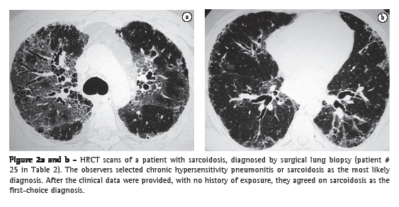The evaluation of HRCT scans for ILDs relies on the subjective interpretation of images and the recognition of abnormal patterns, which are associated with interobserver and intraobserver variations. The lack of adequate training contributes to the variability of image interpretation and confidence in diagnoses made on the basis of HRCT findings.(7-9) The impact of clinical information, the observer expertise and the confidence level for the diagnostic hypotheses on the interobserver and intraobserver agreement in the diagnosis of ILDs based on HRCT scans are important issues that have not been fully evaluated.(7,10)