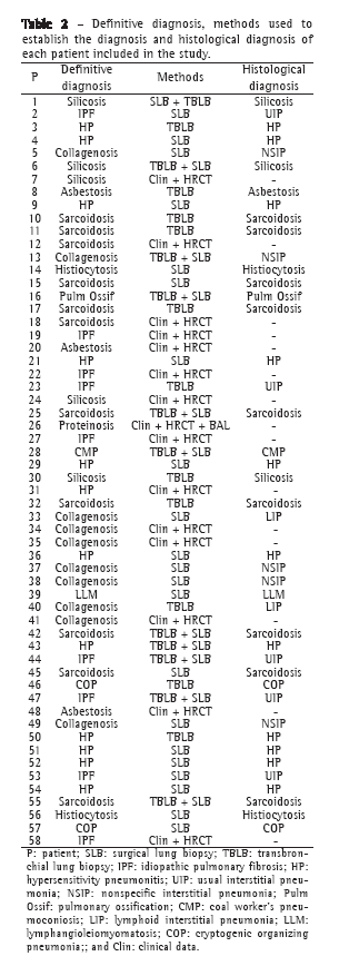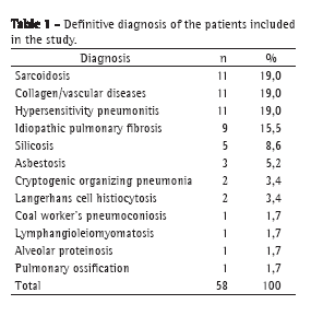 The diagnostic spectrum of the 58 cases encompassed a representative sample of the ILDs seen in our population. The final diagnoses and methods used to establish them are shown in Tables 1 and 2.