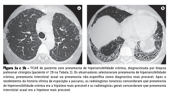 Um grupo de autores,(13) ao avaliar apenas imagens de TCAR de pacientes com pneumonia intersticial idiopática, encontrou um valor de kappa de 0,55 para a concordância interobservador independentemente do grau de confiança e um valor de kappa de 0,65 para a concordância interobservador quanto ao diagnóstico com alto grau de confiança. Outro grupo de autores(9) estudou a variação interobservadores para o diagnóstico de DPIs em uma amostra de 11 radiologistas torácicos, comparando imagens de centros secundários e terciários, e encontrou um valor geral de kappa de 0,48. Nesse mesmo estudo, os valores de kappa variaram de 0,60, em centros secundários, a 0,34, em centros terciários. Esses dados demonstram bem a diferença de concordância entre observadores para casos complexos de centros terciários e para casos simples de centros secundários. Em outro estudo,(7) determinou-se a concordância interobservador quanto ao diagnóstico de pneumonia intersticial idiopática. Um aumento significante na concordância foi encontrado após o recebimento das informações clínicas, uma vez que os valores de kappa aumentaram de 0,72 para 0,80.