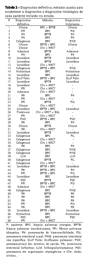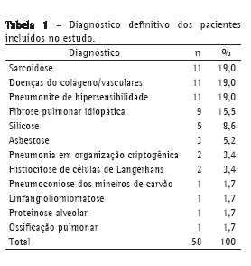 Nosso estudo teve algumas limitações. Embora as DPIs sejam relativamente incomuns, o número de casos analisados foi menor que o investigado em outras séries. Estudos futuros devem investigar amostras maiores para a obtenção de conclusões mais significantes. Outra limitação foi o fato de os pacientes terem sido selecionados em um ambulatório altamente especializado de um centro terciário, o que pode ter levado à inclusão de indivíduos com DPIs complexas, afetando a concordância entre observadores. O ambulatório é também um centro de referência para algumas afecções, inclusive pneumonite de hipersensibilidade (PH). Isso explica a distribuição não usual dos casos, sendo que a PH foi uma das doenças mais comuns, e a fibrose pulmonar idiopática foi menos frequente que em outras séries. No entanto, os pacientes incluídos constituíram uma amostra representativa das doenças observadas em nossa população.