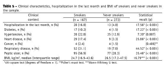 We found that the number of hospitalizations in the last month and the incidence of diseases typically associated with smoking, such as diabetes, hypertension, heart disease, respiratory disease and peptic ulcer, were higher among smokers. Smoking has been reported as being a risk factor for peptic ulcer, diabetes mellitus, cardiovascular diseases, asthma, COPD, lung cancer and other types of cancer.(4) Tobacco, in all of its forms, increases the risk of premature death and of having physical limitations caused by coronary diseases, arterial hypertension, stroke, bronchitis, emphysema and cancer.(27)