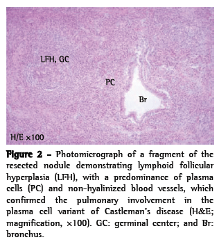 The anatomopathological examination of the surgical sample revealed two adjacent nodules (of 1 cm and 2 cm in diameter) in the apical segment. The two nodules presented lymphoid follicular hyperplasia, with a predominance of plasma cells and non-hyalinized blood vessels, which confirmed the pulmonary involvement in the plasma cell variant of Castleman's disease. Localized disease was not identified in the lymph nodes resected (Figures 2 and 3).