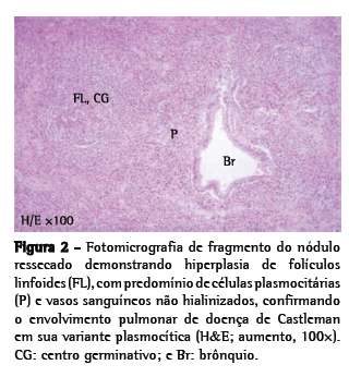 O exame anatomopatológico da peça operatória identificou, em seu segmento apical, dois nódulos adjacentes (com 1 e 2 cm de diâmetro), ambos demonstrando hiperplasia de folículos linfoides, com predomínio de células plasmocitárias e vasos sanguíneos não hialinizados, confirmando o envolvimento pulmonar de doença de Castleman em sua variante plasmocítica. Não houve identificação de doença localizada nos gânglios ressecados (Figuras 2 e 3).