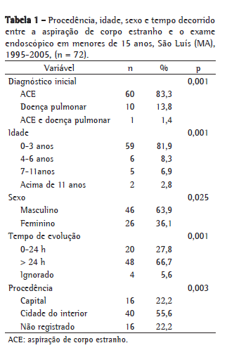 ResultadosO diagnóstico inicial foi de ACE em 83,3% dos casos, seguido de doença pulmonar (13,8%), sendo esta diferença estatisticamente significante (p < 0,001). Foram também relevantes a idade inferior a três anos (81,9%; p < 0,001), sexo masculino (63,9%; p = 0,025), tempo decorrido entre o episódio de aspiração e o diagnóstico definitivo acima de 24 h (66,7%; p < 0,001) e procedência de cidade do interior (55,6%; p = 0,003; Tabela 1). Os sinais e sintomas mais frequentes foram dispneia (77,8%), tosse (61,1%) e crepitações difusas (43,5%; dados não mostrados em tabela).