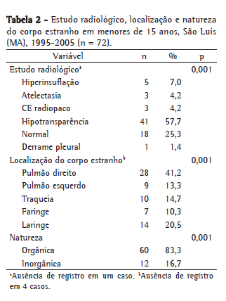 A alteração radiológica mais observada foi hipotransparência (57,7%; p < 0,001), seguida de hiperinsuflação (7,0%), atelectasia (4,2%) e corpo estranho radiopaco (4,2%). Em 25,3% dos casos, a radiografia de tórax estava normal. A localização mais frequente do corpo estranho foi o pulmão direito (41,2%; p < 0,001), enquanto que a natureza do corpo estranho mais frequente foi a orgânica (83,3%; p < 0,001; Tabela 2).