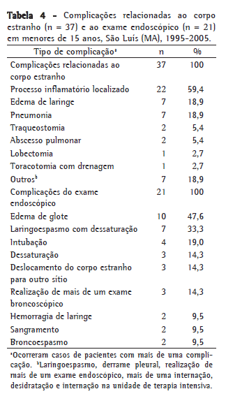 As principais complicações relacionadas à presença de corpos estranhos são explicadas pela sua localização (pulmão, traqueia e laringe), natureza (predominantemente orgânica) e tempo de permanência. O processo inflamatório localizado pode ser explicado pela localização predominante do corpo estranho no pulmão e na traqueia, enquanto o edema da laringe pode ser explicado pela aspiração de espinha de peixe e sua localização nesse sítio.(1,2,10,21)
