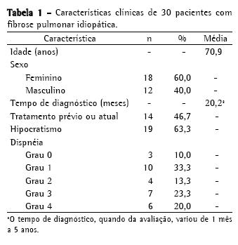 Resultados As características clínicas da amostra estão demonstradas na Tabela 1. Dos 30 pacientes avaliados, 18 eram mulheres e 12 eram homens. A média de idade foi de 70,9 anos, variando de 51 a 93 anos. Em 15 dos 30 pacientes, o diagnóstico de FPI foi confirmado pela biópsia cirúrgica a céu aberto antemortem; nos demais, o diagnóstico foi estabelecido com base nos critérios da American Thoracic Society.(1)