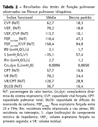A técnica de oscilações forçadas ainda não dispõe de valores de normalidade para a complacência dinâmica. Entretanto, a extensão do efeito da fibrose na Crs,dyn dos pacientes estudados pode ser facilmente avaliada, considerando a média encontrada no presente estudo (10 mL/cmH2O) e os valores médios em indivíduos normais, reportados anteriormente (40 mL/cmH2O).(27)