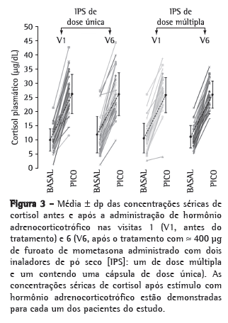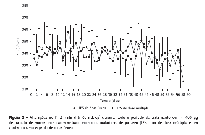 Estudos in vitro que seguem a metodologia de múltiplos pratos (impactador em cascata de Andersen), que simulam as diferentes regiões anatômicas da árvore respiratória, são utilizados como um método fidedigno e reprodutível de mensuração e comparabilidade entre produtos sob a forma de pó seco inalatório, uma vez que, em estudos in vivo, a detecção sérica do princípio ativo inalado é dificultada pelas baixas concentrações do mesmo.(14) Os estudos realizados com essa metodologia demonstraram que um IPS de dose única semelhante ao utilizado no presente estudo gerou elevado número de partículas de tamanho pequeno e com baixa dispersão.(15) Fluxos inspiratórios mais elevados são alcançados com IPS de dose única em comparação ao de um IPS de dose múltipla (Turbuhaler), o que pode aumentar a deposição pulmonar.(16) Um grande estudo multicêntrico aberto semelhante ao atual demonstrou resultados equivalentes quando os efeitos da budesonida foram comparados em asmáticos através de IPS de dose única e dose múltipla (Aerolizer e Turbuhaler).(17) Outro estudo demonstrou que a administração de mometasona, 400 µg ao dia, por IPS de dose múltipla, tem eficácia no combate à asma semelhante à budesonida, 400 µg duas vezes ao dia.(18) Pela semelhança de resultados no presente estudo, pode-se inferir que os resultados com IPS de dose única seriam semelhantes.
