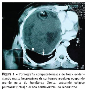 Uma paciente de 27 anos, natural e procedente de Taquara (RS), previamente hígida, procurou atendimento médico em sua cidade por apresentar dor torácica e dispnéia progressiva. Estudo radiológico realizado na urgência revelou opacidade quase total do hemitórax direito. Foi então submetida à toracocentese de alívio com saída de 500 mL de líquido de aspecto purulento, o que levou à suspeita de empiema pleural. Devido a esses achados a paciente recebeu antibioticoterapia e foi encaminhada ao Serviço de Cirurgia Torácica do Hospital Nossa Senhora da Conceição, em Porto Alegre (RS). No momento da internação já se encontrava assintomática. A paciente estava afebril e referiu não ter apresentado este sintoma nos dias anteriores. Devido a não melhora radiológica realizou-se tomografia computadorizada de tórax que evidenciou massa pulmonar heterogênea, de contornos regulares, medindo 10,1 x 11,7 cm, e ocupando os dois terços inferiores do hemitórax direito, sem invasão das estruturas adjacentes (Figura 1).