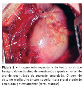 Teratomas mediastinais são raros e contribuem com 8 a 13% dos tumores nesta região. Ocorrem primariamente no mediastino anterior e em adultos jovens.(1,2) Teratomas do mediastino originam-se de células germinativas pluripotentes e são compostos de uma grande diversidade de tecidos originados das três camadas embrionárias.(2,3) Podem conter vários tipos de tecidos: epiteliais, musculares, cartilagens e até dentes. Os teratomas benignos são geralmente de crescimento lento, assintomáticos por longos períodos ou demonstrando sintomas mínimos, muitas vezes não valorizados tanto pelo paciente quanto pelo médico. São descobertos freqüentemente quando um radiograma de tórax de rotina é feito. Normalmente surgem como massas bem circunscritas e são ressecados geralmente sem muita dificuldade.(2,3,4)