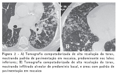 Ao exame físico, encontrava-se dispnéica (+/4+) em repouso, sem cianose ou hipocratismo digital. A ausculta revelava estertores em manguito nas bases pulmonares. O exame cardiovascular era normal. Havia ausência da mama esquerda. A espirometria mostrava distúrbio restritivo, com volume expiratório forçado no primeiro segundo de 55% do predito, e capacidade vital forçada de 47% do predito. A paciente estava em programação para realização de quimioterapia, fundamentada na suspeita de recidiva do câncer de mama na forma de linfangite carcinomatosa. Em que pese mostrar a tomografia computadorizada de alta resolução áreas de espessamento do interstício interlobular nas áreas apicais bilateralmente (quadro compatível com a linfangite), chamavam a atenção nos lobos inferiores extensas áreas de densidade em vidro fosco, entremeadas ao referido espessamento do interstício, configurando aspecto de pavimentação em mosaico, o que não é usualmente descrito naquela condição.