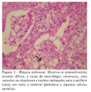 Tendo em vista o antecedente de ingestão prolongada de vários tipos de laxantes, alguns deles contendo óleo mineral, foi levantada a suspeita de pneumonia lipóide crônica. A paciente foi submetida a biópsia pulmonar a céu aberto, que confirmou este diagnóstico (Figura 3). Foi suspenso o uso de laxantes à base de óleo mineral. Após quatro meses de evolução não foi constatada melhora clínica ou radiológica apreciável.